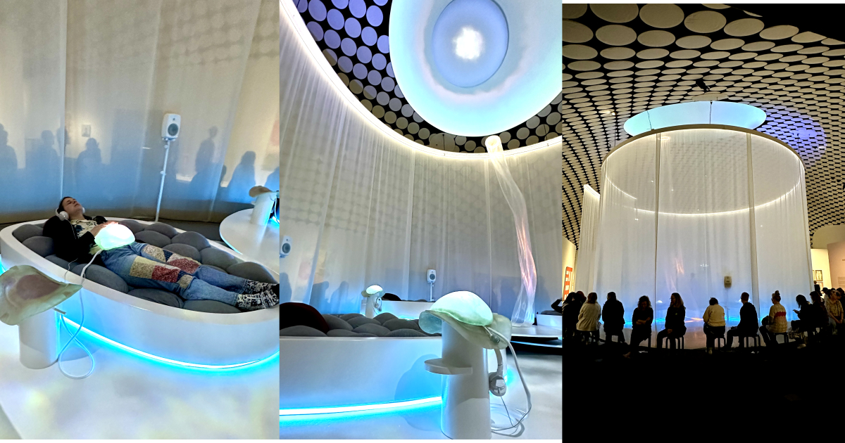 Piti odottaa 30 minuuttia jonossa, kesti 5 min ja 4 ihmistä makasi sisällä yhtä aikaa. Mahan päälle asetettiin 4kg asia. Kuulokkeista kuului eläinten ääniä ja vatsan päällä oleva asia värisi.